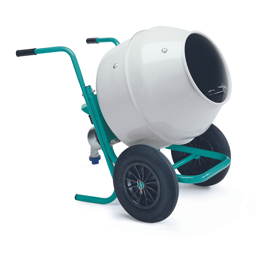 Small-sized concrete mixers. Electric motor. Drum capacity: 134 l. Optional rotating pivoting support.