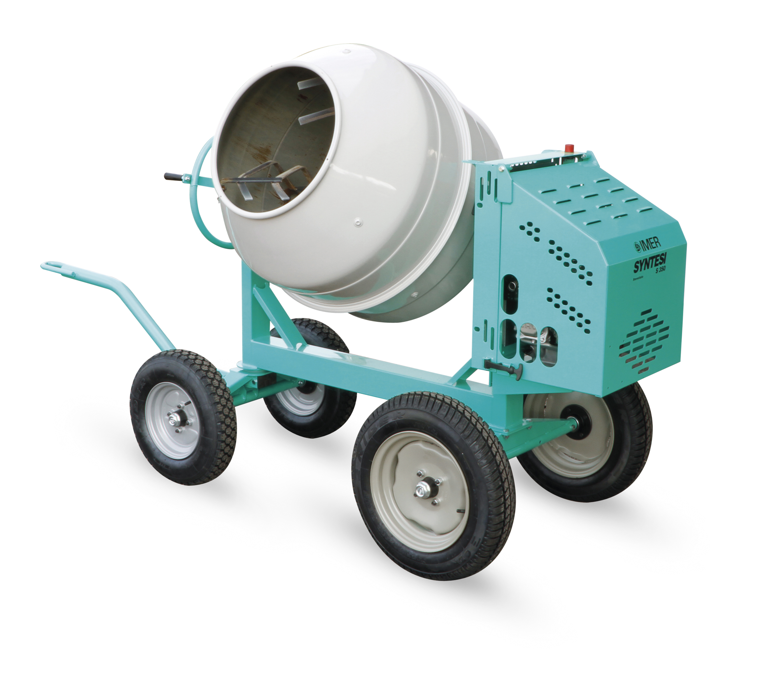 Concrete mixer with four pneumatic wheels. Diesel engine. Drum capacity: 350 l.